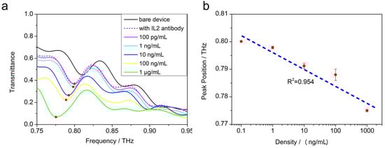 To demonstrate the ability of the novel sensor device to detect lower-molecular-weight biomolecules, different concentration gradients of IL-2 serum solutions were prepared. The samples were dried naturally after they had been dropped on the devices. Then, the device was rapidly examined using the Fourier infrared spectrometer to get the transmission spectra, which are shown in Figure 7.