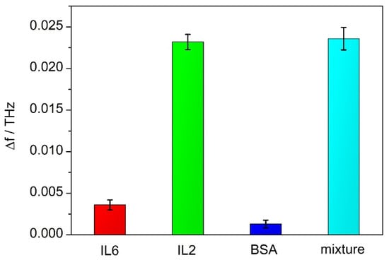 In order to investigate the specific recognition ability of the antibody-functionalized THz biosensors, pure BSA and a mixture of IL-2, IL6 (Sangon Biotech) and BSA were selected as distractors. We dropped four solutions on the surfaces of the devices functionalized by the IL-2 antibody, respectively, 1 μg/mL IL6 solution, 1 μg/mL IL-2 solution, 1 μg/mL BSA solution and the mixture solution. Then we dried the surfaces of the devices according to the above method. The resonance peak shifts f of these devices and error bars are shown in Figure 8. The experiments were repeated three times.