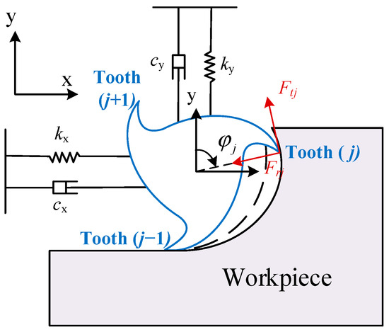 The milling dynamics model is the basis for studying the stability of the milling process. In this Section, a two-degree of freedom (DOF) milling system (as shown in Figure 1) is used to derive the dynamics model of the milling process. In Figure 1, and are the tangential and normal cutting force components acting on the cutting tooth (), respectively. is the angular position of the tooth () and can be calculated by the following formula: