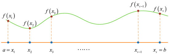 Here, we take one-dimensional space as an example to briefly introduce the DQM. As shown in Figure 2, is a continuous differentiable function defined on the interval , which is divided by nonoverlapping nodes. According to the interpolation theory, we can get