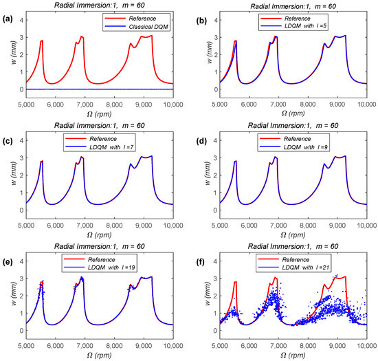 Figure 3a–f show the SLD obtained using classical DQM and LDQM with different values of parameter , respectively. Among them, Figure 3a shows the SLD obtained using classical DQM, while Figure 3b–f show the SLD obtained using LDQM with the local parameter being selected as 5, 7, 9, 19, and 21. As previously analyzed, classical DQM is prone to generating ill-conditioned coefficient matrices when a large number of nodes are used, which will affect the stability of the calculation results. This phenomenon is intuitively reflected in Figure 3a. Compared with the reference results, the stability limits obtained using the classical DQM, represented by the blue line in Figure 3a, is a completely incorrect result. However, the results from Figure 3b–d indicate that LDQM can effectively compensate for the deficiency of the classical DQM, resulting in completely correct stability limits. Meanwhile, as the local parameter increases, the calculation accuracy of LDQM also improves. However, it is worth noting that as the local parameter further increases, the SLD obtained using LDQM exhibits unstable oscillations, as shown in Figure 3e,f. Moreover, the larger the local parameters is, the more serious the oscillation of the SLD is. This phenomenon once again confirms that when the number of nodes is large, the weighted coefficient matrix will become ill-conditioned. At the same time, this phenomenon also shows that the choice of local parameter has a significant impact on the calculation results of LDQM, and also provides ideas for the selection of the local parameter.