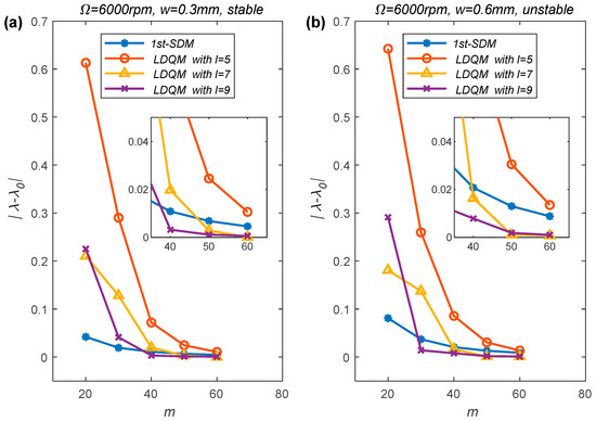 Next, the convergence rate of LDQM is also studied on the basis of the single-DOF milling model and compared with that of the 1st-SDM through numerical simulation. Let denote the exact value of the spectral radius of the Floquet transition matrix, denote the approximate value of the spectral radius of the Floquet transition matrix obtained using 1st-SDM or LDQM. The difference between and is represented as a discrete function in terms of the discrete parameter . The simulation condition is down-milling, the radial immersion ratio is set as 1 and the spindle speed is selected as 6000 rpm, two axial depths ( and ) of cutting under the stable and unstable processing conditions are selected, and the exact value of is determined via 1st-SDM with . The numerical simulation results are displayed in Figure 4.