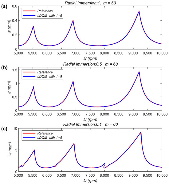 In Figure 5a–c, the radial immersion ratios are 1, 0.5 and 0.1, respectively. The number of the discrete grid is selected as 60. It can be seen from Figure 5 that under the above three cutting conditions, the stability limits calculated by LDQM with show perfect agreement with the reference stability limits.