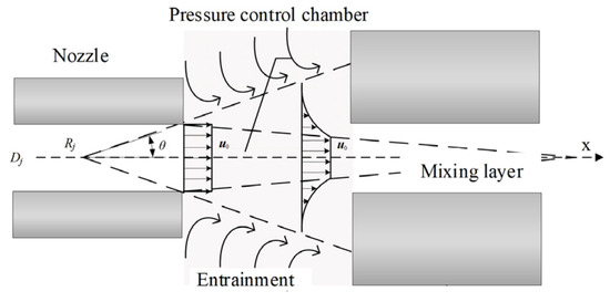 As shown in Figure 3, ignoring the impact of other structures on the jet’s state, the fluid ejected from the nozzle forms a velocity-discontinuity interface with the surrounding motionless gas due to its initial velocity. The fluid velocities on different interfaces vary and are discontinuous. According to turbulent fluid dynamics, the fluid on the velocity-discontinuity interfaces fluctuates and inevitably develops into vortices, leading to turbulence. Turbulence will entrain initially stationary gas into the jet, causing jet entrainment phenomena [20,21].
