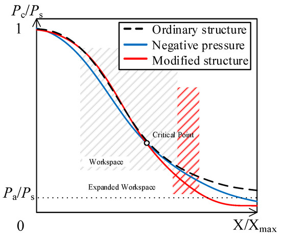 Comparison of characteristic curves. The curves in the figure represent the displacement-pressure characteristic curves of the mechanism. The black curve represents the flapper–nozzle mechanism, the blue curve represents the negative-pressure flapper–nozzle mechanism, and the red curve represents the modified negative-pressure flapper–nozzle mechanism with modifications to the throttle nozzle. The critical point indicates the state where the airflow reaches full expansion exactly at the exit of the convergent–divergent nozzle and Pa represents atmospheric pressure.