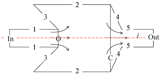 where Sj represents the area of section j and n represents the unit normal vector to the flow field D, pointing outward from the flow field. Since there are no vorticities on surfaces 1, 2, and 3, and assuming that the flow in sections O and C is uniform, the entire flow field is symmetric about the i-axis, and asymmetrical flow in the flow field is ignored. The momentum conservation equation along the i-axis is as follows: