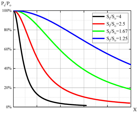 Flapper–nozzle characteristic curves. Sf represents the flow area of the nozzle, and so represents the flow area of the throttle. The black curve represents the system’s characteristic curve for Sf/So = 1.25, the red curve represents Sf/So = 2.5, the green curve represents Sf/So = 1.67, and the blue curve represents Sf/So = 4.