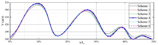 Jet axial velocity distribution in front of the nozzle. The six curves represent six different grid partitioning schemes, with Scheme 4 applied in subsequent calculations.