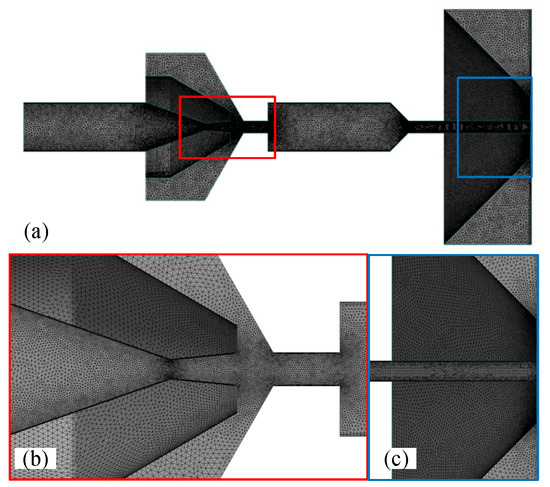 Computational domain grid of the flapper–nozzle system. (a) shows the grid division of half of the internal flow field of the assembly. To facilitate observation, the grid area around the nozzle orifice has been proportionally enlarged. (b,c) enlarge the details of the corresponding color area displayed.