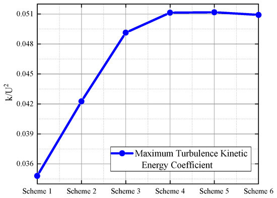 For high Reynolds number flow, the RNG k-ε turbulence model was applied to compute the geometrical models of the six grid schemes. The evaluation of interest in this study focused on flow velocity and turbulence kinetic energy. The impact of these 6 grid schemes on the calculation results at the same position in the flow field was analyzed. The maximum turbulence kinetic energy coefficient in the flow field was extracted at the exit of the orifice for comparison. As shown in Figure 11, the maximum turbulence kinetic energy coefficient in the flow field steadily increases with the increase in grid density. Starting from scheme 3, further grid refinement has almost no effect on the maximum turbulence kinetic energy coefficient. It can be observed that turbulence kinetic energy is highly sensitive to grid density, but it converges after reaching the grid density of scheme 4. Further, increasing grid density does not change the turbulence kinetic energy calculation results; thus, to save computational resources while ensuring accuracy, scheme 4 was chosen for grid division in all computational models.