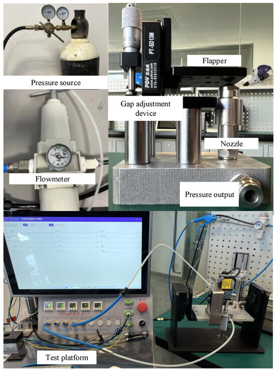 To validate the theoretical calculations and simulation results, an experimental setup, namely a flapper–nozzle displacement-pressure test bench, was constructed for this study. The prototype is depicted in Figure 12 and the experimental bench is illustrated in Figure 13. The primary components of the experimental bench include an air pressure source, flow meter, flapper–nozzle device, and data acquisition system. The flow meter integrates functions such as air pressure adjustment, measurement, and flow measurement. The initial gap between the nozzle and the flapper is determined by a spiral structure. The time interval of the experiment is measured and collected by a laser-ranging instrument, and the gap between the flappers is adjusted by a spiral device driven by a stepper motor. The test bench is employed to gather real experimental data, including the gap between the flappers, backpressure chamber pressure, and flow rate. The experimental setup comprises several components, including a high-pressure air source, a pressure regulator, a flow meter, a flapper–nozzle device, a pressure gauge, and a data acquisition system. The high-pressure air source, capable of a maximum output pressure of 15 MPa, supplies clean and dry high-pressure air to the flapper–nozzle. Following its release from the high-pressure air source, the gas enters the pressure regulator, which adjusts the gas pressure to 0.4 MPa. Subsequently, the gas enters the flow meter to record flow information before entering the flapper–nozzle mechanism. The data acquisition system is connected to the backpressure chamber of the flapper–nozzle mechanism to collect pressure data.