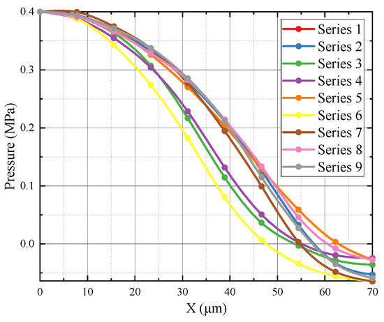 The convergent section of the orifice has throat angles set at 15°, 30°, and 45°, with lengths of 0.5 mm, 1 mm, and 1.5 mm. The divergent section angles are set at 0°, 5°, and 10°, with lengths of 1.5 mm, 2.5 mm, and 3 mm. An orthogonal experimental design is employed. This is a method for studying multi-factor and multi-level designs, which selects representative points from a comprehensive experiment based on orthogonality. These representative points possess characteristics of “uniform dispersion and comparability”. Orthogonal experimental design is a primary method for analyzing factorial designs and an efficient, rapid, and economical experimental design method [25]. The orifice selection study is a 4-factor, 3-level experiment, which requires 43 = 64 combinations of experiments without considering the repetition of each combination. As shown in Table 3, by utilizing the L9(34) orthogonal table for experiment arrangements, only nine experiments are needed, significantly reducing the workload. The flapper displacement is moved from 10 µm to 100 µm, with simulations conducted every 10 µm and the backpressure chamber’s internal pressure recorded. Simulations are conducted for test series 1–9, and the results are shown in Figure 14. Figure 14 illustrates the orthogonal numerical simulation results. Series 3, 4, and 6 are not effective at suppressing jet development at small clearances. Series 2, 7, and 9, although effective at inhibiting jet expansion at small clearances, prematurely reach a critical state inside the jet, leading to excessive pressure drop at the throat of the characteristic curve and making it non-linear. Series 1, 5, and 8 are closer to the ideal characteristic curve. Considering practical production difficulties and other factors, Series 5’s structure is selected as the orifice.