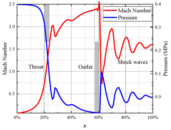 When the backpressure is 0 MPa, the airflow accelerates at the throat of the nozzle, forming two intersecting oblique shockwaves. The airflow continuously accelerates in the expansion section, reaching a maximum velocity of 2.4 Mach, but it does not achieve complete expansion at the outlet. After exiting the nozzle, a series of expansion waves are formed and the airflow continuously accelerates before the expansion waves, while the pressure continuously decreases. After passing through the expansion waves, it suddenly decelerates, causing a pressure increase; this process occurs repeatedly. With increasing backpressure, the transverse shockwave at the outlet continuously moves toward the interior of the nozzle until it reaches the throat. Correspondingly, the jet velocity generated by the nozzle gradually decreases. When the backpressure is 0.1 MPa, the gas at the nozzle outlet (just) reaches a fully expanded state, with the pressure nearly matching the backpressure. Supersonic flow is observed throughout the entire range of backpressure variation, even when the backpressure is 0.3 MPa, and expansion waves appear at the nozzle throat.