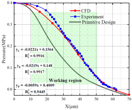 Numerical simulations and experimental calculations were performed; the results are shown in Figure 18. The red curve represents the results obtained from the numerical simulations. Experiments were conducted on the primitive flapper–nozzle system and its characteristic curve was obtained (black line in the figure). The geometric modeling and grid partitioning are the same as in Section 3.4, and due to computational accuracy considerations, a simulation calculation was performed for every 10 μm of flapper movement. The blue curve represents the experimental values of pressure inside the backpressure chamber. The nozzle was fixed in front of the flapper, and the gap length between the nozzle and the flapper was adjusted using a spiral device. Experiments were conducted at 5-μm intervals to obtain the displacement-pressure characteristic curve for the system.