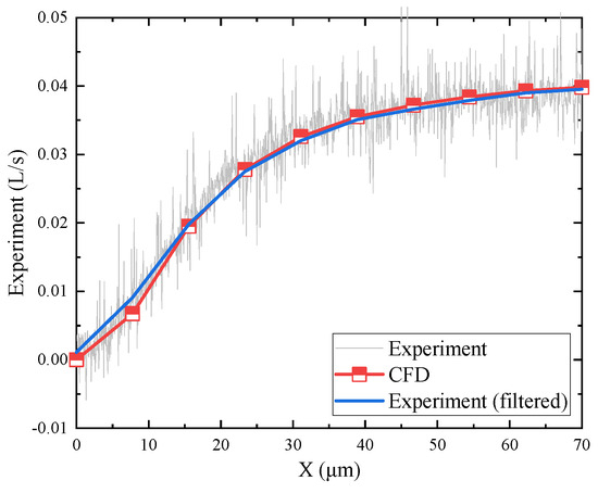 The experimental and simulation results of flow rate changes during the operation of the mechanism are shown in Figure 19. The grey curve in the figure represents the flow rate data collected using a flow meter. The blue curve represents the data obtained after filtering and noise reduction. The red broken line represents the simulation results calculated every 10 μm of flapper displacement. Compared to the simulation results, the experimental data show minor gas flow, even when the flapper is not moving. Nevertheless, the overall trend of flow rate change is similar in both cases, with larger variations when the flapper displacement is small. The flow rate curve is quite steep at the initial stage, but as the flapper displacement continues to increase, the flow rate curve gradually becomes smoother.