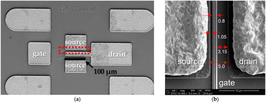 The red dotted frame in Figure 1a shows the scanning electron microscope image of the unit device consisting of the gate, source, and drain electrodes, and the width of the unit device is 100 μm. Figure 1b depicts the specific dimensions of the unit device of the 0.18 μm T-gate AlGaN/GaN HEMT. The source-to-drain (), gate-to-source (), and gate-to-drain () lengths of the unit device are 5, 1.05, and 3.15 μm, respectively.