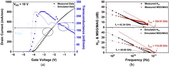 Comparison between the measured and simulated results: (a) drain current-gate voltage (-) transfer characteristics, (b) cut-off frequency, and maximum frequency of a basic T-gate HEMT at a drain voltage () = 10 V and a gate voltage () = −3 V.