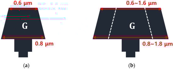 To improve the characteristics, we varied the gate-head extended length. We increased and of the basic T-gate HEMT, which were originally 0.6 and 0.8 μm, respectively. Additionally, and were symmetrically extended in 0.2 μm steps up to 1.0 μm, as shown in Figure 4.