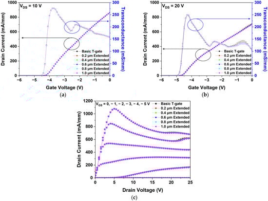 We simulated and analyzed the DC characteristics of basic T-gate and gate-head extended HEMTs. Figure 5a,b show the transfer characteristics simulated at values of 10 and 20 V, respectively. Additionally, and increased, and and increased slightly. However, almost no significant changes are observed, and remains constant at −4.3 V, as shown in Figure 5a.
