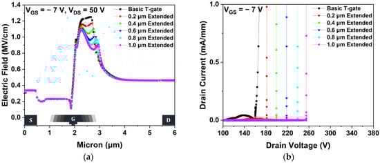 Simulations using different gate-head extended structures: (a) electric field distributions across the two-dimensional electron gas channel layer between the source and drain electrodes at VGS = −7 V and VDS = 50 V and (b) breakdown voltage characteristics at VGS = −7 V.