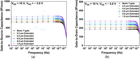 Capacitance characteristics as a function of frequency for different gate extended structures: (a) gate-to-source capacitances and (b) gate-to-drain capacitances.