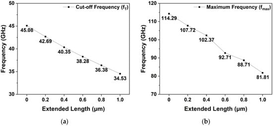 Simulated frequency values of the gate-head extended HEMTs at = 10 V and = −3 V: (a) and (b) .
