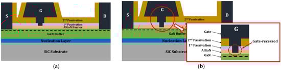 Cross-section schematics of the 1.0 μm extended HEMT: (a) non-gate-recessed structure and (b) gate-recessed structure.