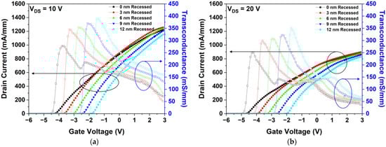 As shown in Figure 10a, the of the 0, 3, 6, 9, and 12 nm recessed structures were −4.3, −3.7, −3.1, −2.5, and −1.9 V, respectively, and the simulated values of were 276.89, 344.91, 353.99, 370.06, and 389.84 mS/mm, respectively. The of the 12 nm recessed structure improved by 40.79% with respect to that of the non-gate-recessed structure. In Figure 10b, when a of 20 V is applied, the severe SHE affects the reduction of the drain current. Additionally, and were confirmed to exhibit similar tendencies to those of the corresponding simulated parameters at a drain voltage of 10 V.