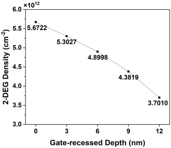 Figure 11 shows the simulated 2-DEG densities of the five different gate-recessed structures simulated under the zero-bias condition. The 2-DEG density was observed to decrease as the gate-recessed depth increased; the 2-DEG density as a function of AlGaN barrier thickness was consistent with the theoretical calculation reported in previous studies [,,].