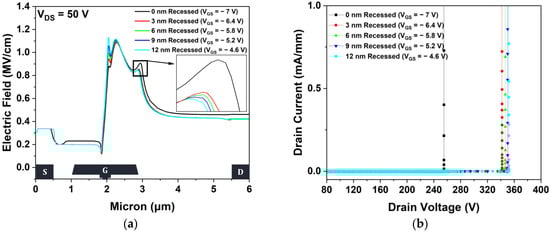 Figure 12a shows the electric field distributions in the 2-DEG channel layer of the 0, 3, 6, 9, and 12 nm recessed structures. Considering the shift, the electric fields of the structures were simulated at values of −7, −6.4, −5.8, −5.2, and −4.6 V. The gate-recessed structure can redistribute the electric fields that are concentrated at a drain-side gate edge, unlike the non-gate-recessed structure. However, when the results obtained from the 3, 6, 9, and 12 nm recessed structures were compared, no significant changes were found in the electric field distributions. Figure 12b shows the values of the five different gate-recessed structures simulated at a pinch-off. The values of the 0, 3, 6, 9, and 12 nm recessed structures were 255.11, 342.03, 346.83, 350.33, and 351.85 V, respectively. The decrease in the electric field increased . Additionally, the recessed gate electrode in the AlGaN barrier results in close proximity between the gate and the channel, which improves carrier density. This increased carrier density generates a large depletion region around the gate and can increase the breakdown voltage due to the existence of a high potential barrier that helps prevent impact ionization. The largest was observed in a 12 nm recessed structure, which was improved by 37.92% with respect to that of the non-gate-recessed structure.