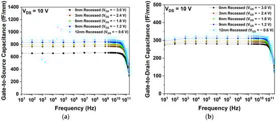 Capacitance characteristics as a function of frequency for different gate-recessed structures: (a) gate-to-source capacitances and (b) gate-to-drain capacitances.