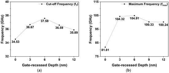 Furthermore, and are simulated as shown in Figure 14, and the same and as those mentioned above are applied. Both and of the gate-recessed structures were higher than that of the non-gate-recessed structures. Furthermore, as the recessed depth increased, and increased up to a certain depth. However, beyond that depth, both and started to decrease. The largest and values of 37.58 and 104.91 GHz were obtained in the 6 nm recessed structure, and these values were improved by 8.83% and 28.24%, respectively, with respect to those of the non-gate-recessed structure. These results were directly affected by the increased value of owing to the decrease in the distance between the gate electrode and the channel. Ideally, the increase in , , and compensated for each other, resulting in constant values of ; increases in and of the active gate region decrease the influence of parasitic capacitance components. Therefore, has a dominant effect in determining the value of . However, at a certain point, when the rate of increase of reduces progressively, is no longer a major factor in determining and . Thus, frequency characteristics such as and can be improved by applying a gate-recessed structure [,]. Consequently, we suggest that the 6 nm recessed structure is the optimized one, considering high and remarkable and .