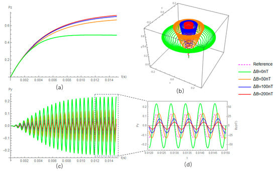 Although there are many kinds of OPMs, the working principle of all is based on the dynamics among the spin polarization vector, the oscillating field (along the y-axis in Figure 1), the main field and light pumping (along the z-axis in Figure 1) and relaxation. Figure 1 illustrates the precession of spins under the different main fields of , where and are the gyroscope ratio of the particle. From Figure 1a, it is clearly shown that the projection of spin on the z-axis (Pz) changes with the main field, which provides one mechanism for detecting , i.e., the so-called Mz magnetometer. One not-so-obvious phenomenon in Figure 1 is the phase difference between spin precession and reference oscillating field , which gives another measurement mechanism of the main field, i.e., the so-called Mx magnetometer. Similarly, can also be measured if the main field, , is kept constant: i.e., the radio-frequency magnetometer called the Hanle effect magnetometer is used in special cases when the main field is equal to zero.