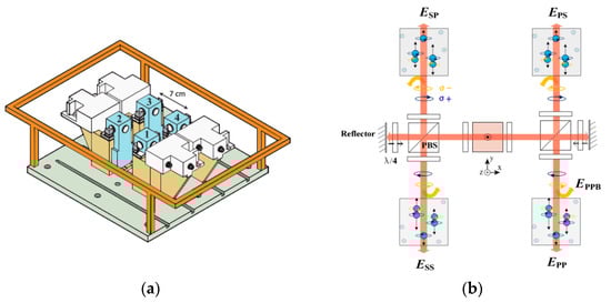 (a) Scheme of a SERF gradiometer where four magnetometers are symmetrically located in the plane of a single feedback field coil []; (b) scheme of a four-channel gradiometer using parametric modulation measurement [].