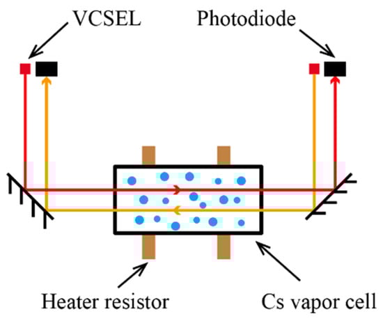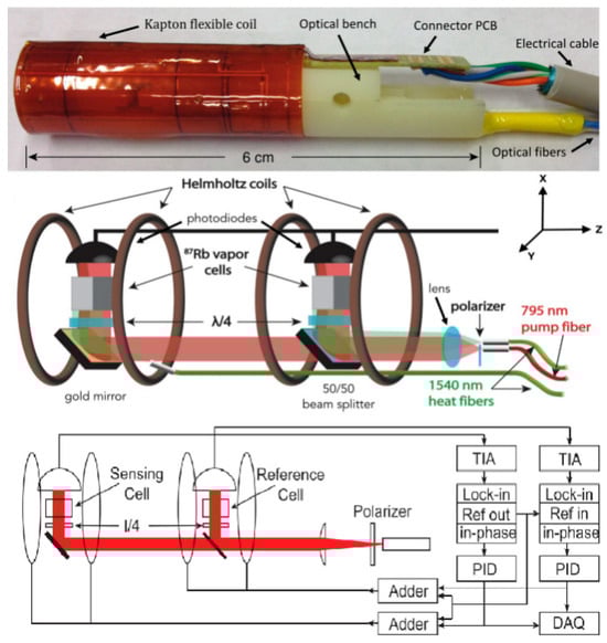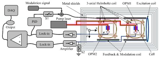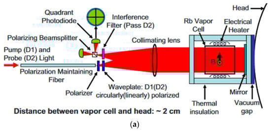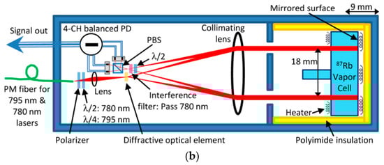 Although a certain baseline is necessary for magnetic field source detection [], a short baseline is preferred to test the instrumental noise floor. Rui Zhang et al. of Geometrics Inc. demonstrated a gradiometer using two miniature scalar OPMs with a size of 2.5 cm × 2.5 cm × 3 cm each. The optical path of the OPM is shown in Figure 16; the pumping light worked in a frequency-modulated Bell–Bloom mode to eliminate crosstalk. The baseline was 2.5 cm when the two OPMs were placed next to each other. A sensitivity of 1 pT from 2 Hz to 50 Hz was achieved in a typical commercial environment without any mu-metal or aluminum shielding [].