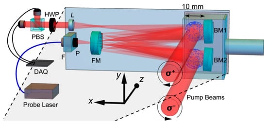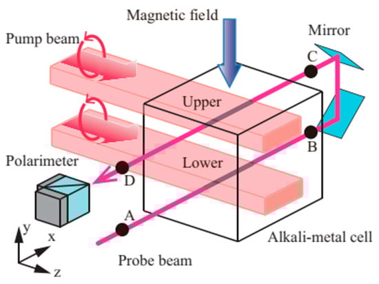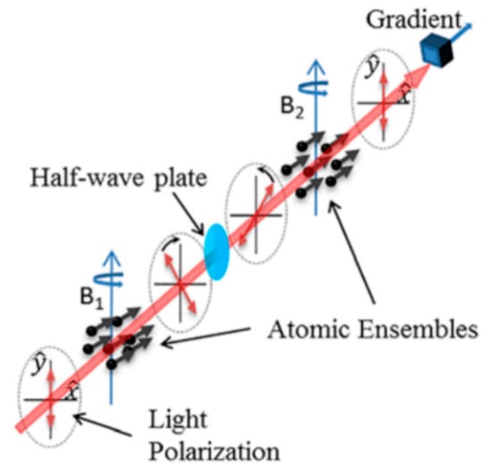 Rui Zhang of Geometrics Inc. discussed a kind of intrinsic, scalar, optically pumped gradiometer using a half-wave plate to reverse the rotation angle of the polarization plate of a probe beam []. Figure 13 shows the probing scheme, where the rotation angle of the polarization plate of the probe beam after two cells is
