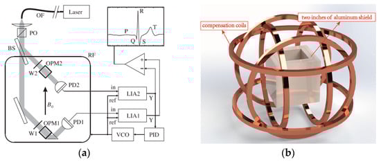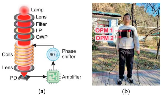 (a) The self-oscillating sensing scheme of the OPMs and (b) their assembly positions on the chest [].