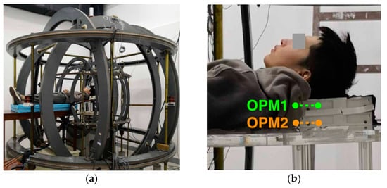 (a) Large coils for MEG in an earth environment and (b) a local enlarged image showing the positions of OPM1 and OPM2 [].
