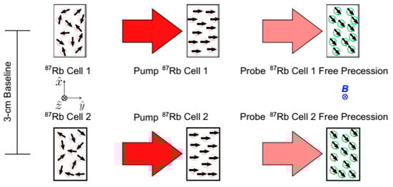 Another scheme was proposed by M.E. Limes et al. from Princeton university. Those authors measured the MEG and MCG signals in an earth magnetic field environment without using active magnetic shielding []. Two cells were used, with a baseline of 3 cm. A short, high-power pulse was used to pump the Rb to spin at close to one hundred percent [], and the FID signal was measured using a far-detuned probe beam. The pulse pumping beam and the probe beam were on the same axis, which was the only dead axis. The three stages, initial, pumping and free precession, are illustrated in Figure 11. The first-order magnetic field gradient signal was obtained by subtracting the frequencies recorded from two alkali vapor cells and dividing the result by the 87Rb gyromagnetic ratio. Richard J Clancy et al. has discussed how well a dipolar source could theoretically be localized through field gradient detection without shielding [].