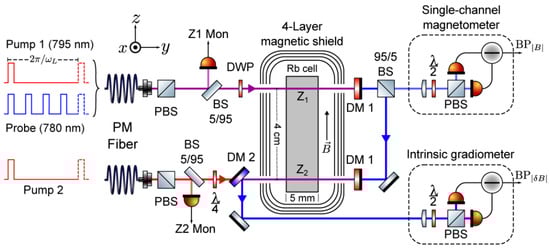 In 2013, Shuhe Wu et al. proposed a magnetic field gradiometer using quantum-enhanced technology. That gradiometer would have eliminated ambient magnetic noise and photon shot noise at the same time. Two beams of light were quantum-mechanically entangled through four-wave mixing (FWM) to squeeze intensity-difference noise [,]. The possibility of realizing subshot-noise magnetometry in practical applications was demonstrated.