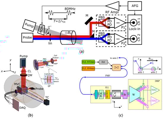 Short-baseline gradiometer detecting different parts of the probe beam: (a) amplitude-modulated pumping and near coincidence of the pumping and probe beam []; (b) optical path of the pulsed pumping and free decay gradiometer []; and (c) frequency-modulated pumping and completely coinciding scheme realized with a coupler, a multiorder wave plate and an interference filter [].