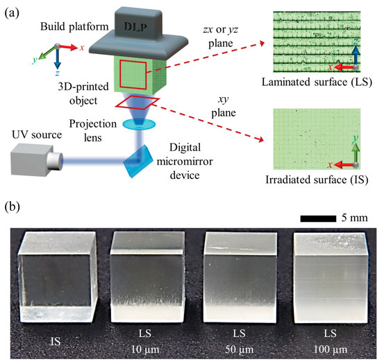 To examine the effects of 3D printing conditions on the surface characteristics of products, we initially designed a cube of 10 mm and exported the design in the form of STL files using SolidWorks 2020, a professional 3D CAD program (Dassault Systèmes SolidWorks Corp., Waltham, MA, USA). Using Asiga Composer 1.3 (Asiga, Sydney, Australia), the design was segmented into layers and lamination conditions were set for layer thicknesses of 10 μm, 50 μm, and 100 μm. Cubic objects with different layer thicknesses were then manufactured utilizing a DLP-based 3D printer (Asiga MAX X27, Asiga, Australia) and printable resin (PlasClear V2, Asiga, Australia) (