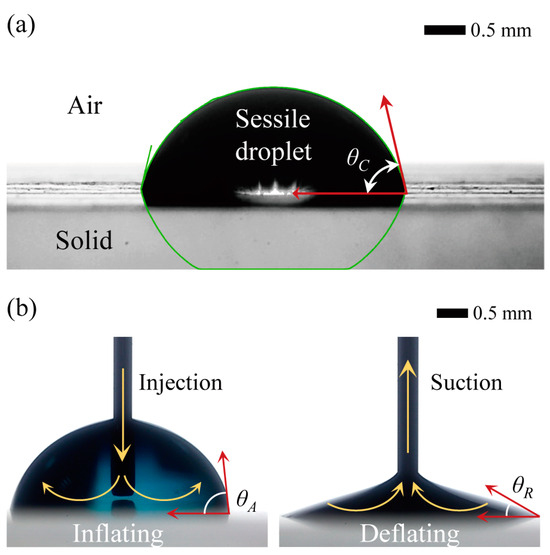 Figure 2). The ACA refers to the maximum CA just before the contact line moves forward on the surface as the droplet volume increases, while the RCA refers to the minimum CA just before the contact line moves backward on the surface as the droplet volume decreases. The ACA and RCA of the sessile droplets can be measured using the LBADSA approach via ImageJ software, which is similar to the CA measurement process.