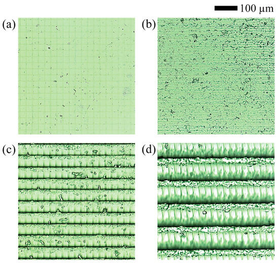 Figure 4). The irradiated surface exhibits the lowest surface roughness compared to the other three surfaces while displaying a microscale lattice pattern of 27 μm in both width and height. This pattern results from the digital micromirror device (DMD) component, which comprises closely grouped small mirrors in a DLP printer. Each mirror of the DMD corresponds to a single pixel, resulting in a lattice pattern that matches the pixel resolution (27 μm) of the DLP printer used in this study. As expected, the surface roughness of the laminated surfaces was observed to increase as the layer thickness increased. In addition, when a layer was cured, the spot closer to the UV light source cured over a larger area than a spot that was farther away. Thus, even in the same layer, a spot closer to the light source had a greater height than other spots.