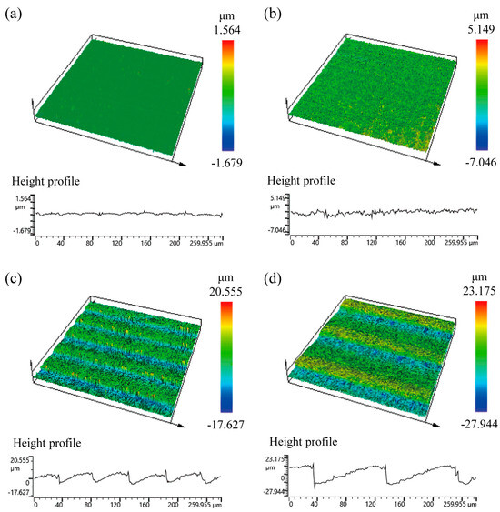 Ra) as the representative measure of surface roughness in this case, which was calculated by taking the average of all the profile values in the roughness profile. The arithmetic mean roughness values for irradiated and laminated surfaces with layer thicknesses of 10, 50, and 100 μm were approximately 0.06, 0.38, 2.57, and 7.03 μm, respectively. We quantitatively demonstrated a direct correlation between the increase in layer thickness and the increase in surface roughness. Due to the variations in roughness caused by different layer thicknesses, it is expected that the printing condition of layer thickness can affect surface wettability.