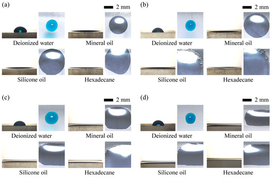 Aqueous and oil-liquid phases were prepared to assess the CA of droplets resting on the surfaces of 3D-printed objects created under varied printing conditions. Aqueous liquid phases included deionized (DI) water and a mixture of DI and Tween 20 (1 mM), while oil–liquid phases included mineral oil (Sigma-Aldrich, St. Louis, MO, USA), silicone oil with a viscosity of 50 cSt (Shinetsu, Tokyo, Japan), and hexadecane (Alfa Aesar, Haverhill, MA, USA). Here, Tween 20, otherwise known as polyoxyethylene (20) sorbitan monolaurate, is a water-soluble surfactant belonging to the polysorbate family [