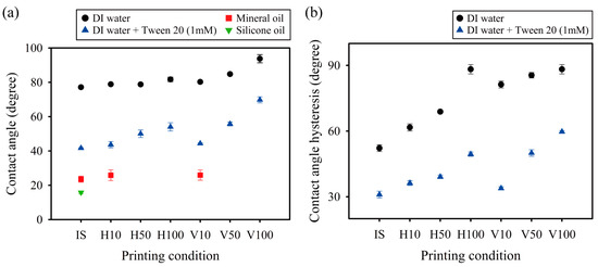 The dependence of CAH of aqueous droplets on printing conditions was further investigated, as shown in