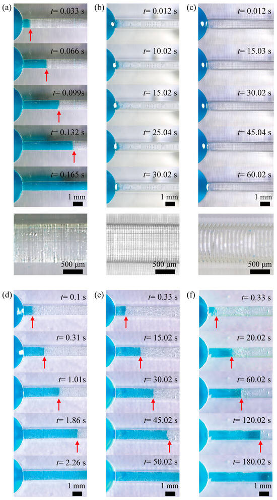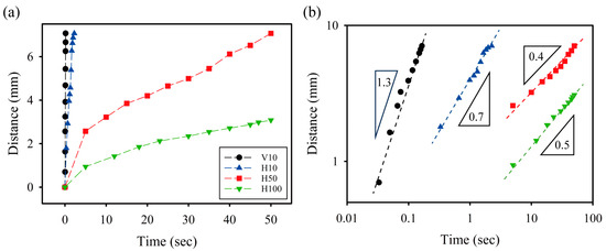 Figure 9b). In the case of relatively high capillary flow velocity—that is, in microfluidic channels constructed by laminating vertically and horizontally with a thickness of 10 μm—the distance traveled by the capillary flow tends to be roughly proportional to time. Conversely, in the case of relatively low capillary flow velocity—that is, microfluidic channels constructed by laminating horizontally with a thickness of 50 μm and 100 μm—the distance traveled by the capillary flow tends to be roughly proportional to the square root of time. These tendencies align closely with the power law correlation between the position of the advancing contact line and time, as discussed in previous literature on the dynamics of capillary flows in microchannels [