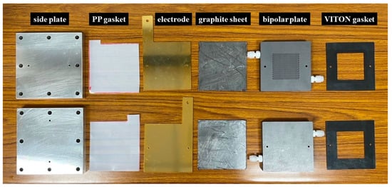 Figure 1 shows the components of the electrolyzer. The system was symmetric, with the same structure on the anode and cathode sides. From the outer to the inner layer, the system consisted of an aluminum side plate, polypropylene gasket, copper electrode with gold coating, flexible graphite sheet, graphite bipolar plate, and VITON rubber gasket. Electrocatalysts on CP with a dimension of 5 cm × 5 cm were placed in the VITON rubber gaskets and covered with a 6 cm × 6 cm anion exchange membrane (Sustainion® X37-50 Grade RT Membrane, Dioxide Materials, Boca Raton, FL, USA).