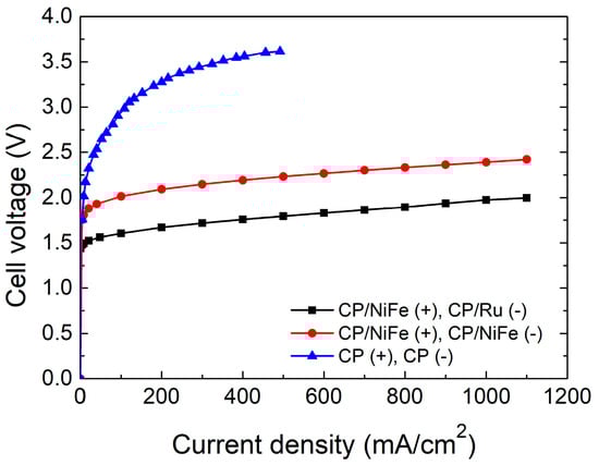 To test the performance of an alkaline water electrolyzer, we adjust the current value output by the power supply to observe the voltage under different current densities. During the test, the current density was adjusted upwards from zero by 100 mA/cm2 at each step, and each current value was held for 20 s to make sure that the voltage value was in a stable state. Figure 2 shows the performance of the electrolyzer. NiFe(+)/Ru(−) is better than NiFe(+)/NiFe(−). For NiFe(+)/Ru(−), the electrolysis reaction starts at 1.49 V, and the electrolyzer shows a current density of 500 mA/cm2 at a cell voltage of 1.79 V. In comparison, for NiFe(+)/NiFe(−), hydrogen and oxygen production are observed at 1.81 V, and the electrolyzer shows a current density of 500 mA/cm2 at a cell voltage of 2.23 V. Bare CP without electrocatalysts was tested for comparison. A comparison of the performance curves revealed that the electrocatalysts are indeed functioning. CP/Ru as a cathode electrocatalyst has better performance than that of CP/NiFe. This shows that Ru is indeed a highly efficient electrocatalyst in the HER reaction [,]. At the same current density, the cell voltage of the NiFe(+)/NiFe(−) system was 0.3–0.4 V higher than that of the NiFe(+)/Ru(−) system. CP/NiFe electrocatalysts can be a feasible option without the use of precious metal, and this can reduce the material cost in a practical alkaline water electrolysis system [].